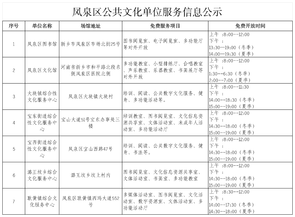 凤泉区公共文化单位服务信息公示