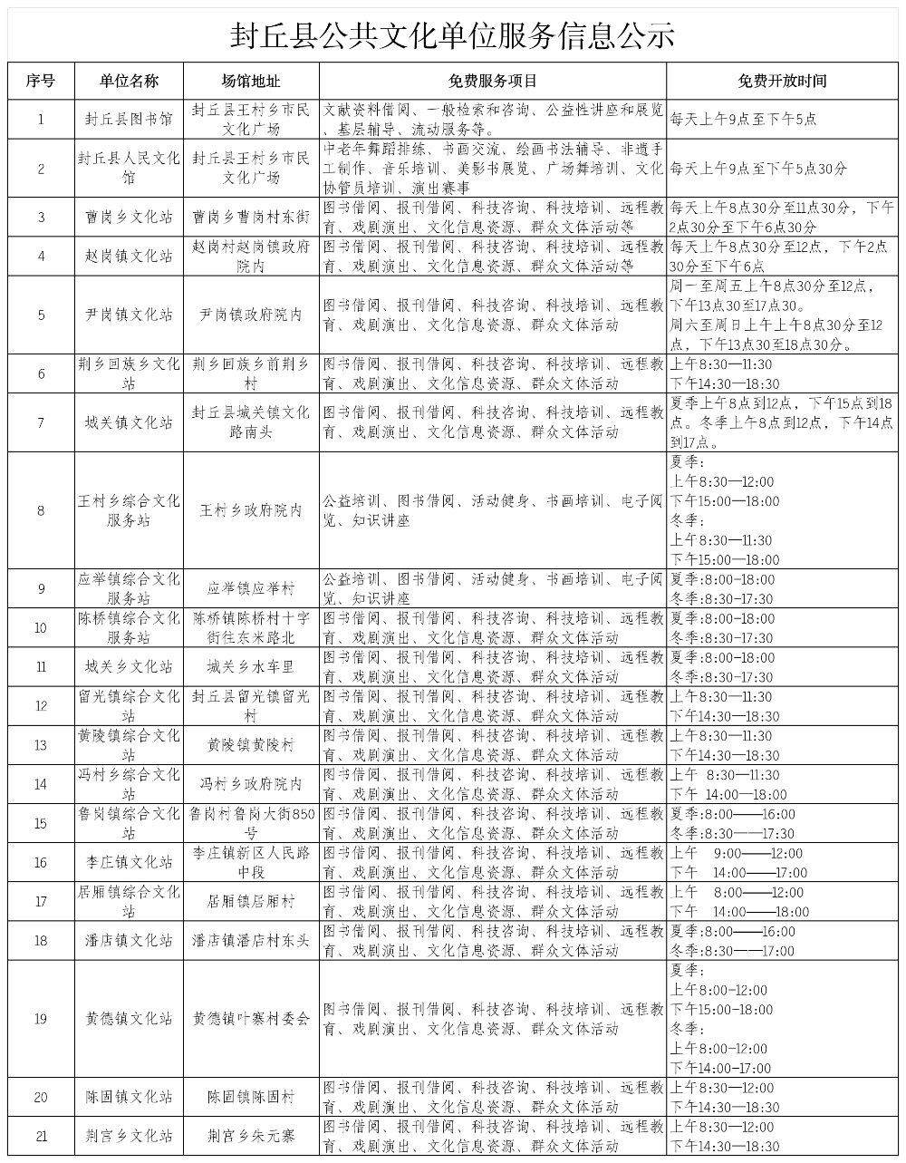 封丘县公共文化单位服务信息公示
