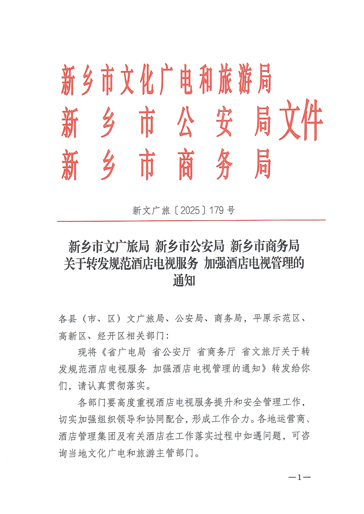 新乡市文广旅局 新乡市公安局 新乡市商务局关于转发规范酒店电视服务 加强酒店电视管理的通知