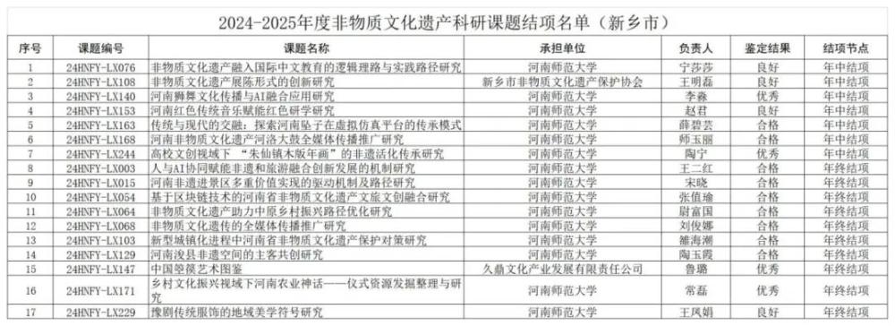 近日,河南省文化和旅游厅公布2024—2025年度非物质文化遗产科研课题结项结果,新乡市范围内的17个课题历经资格审查、专家评审、公示等严格流程,分年中、年终两批顺利结项。