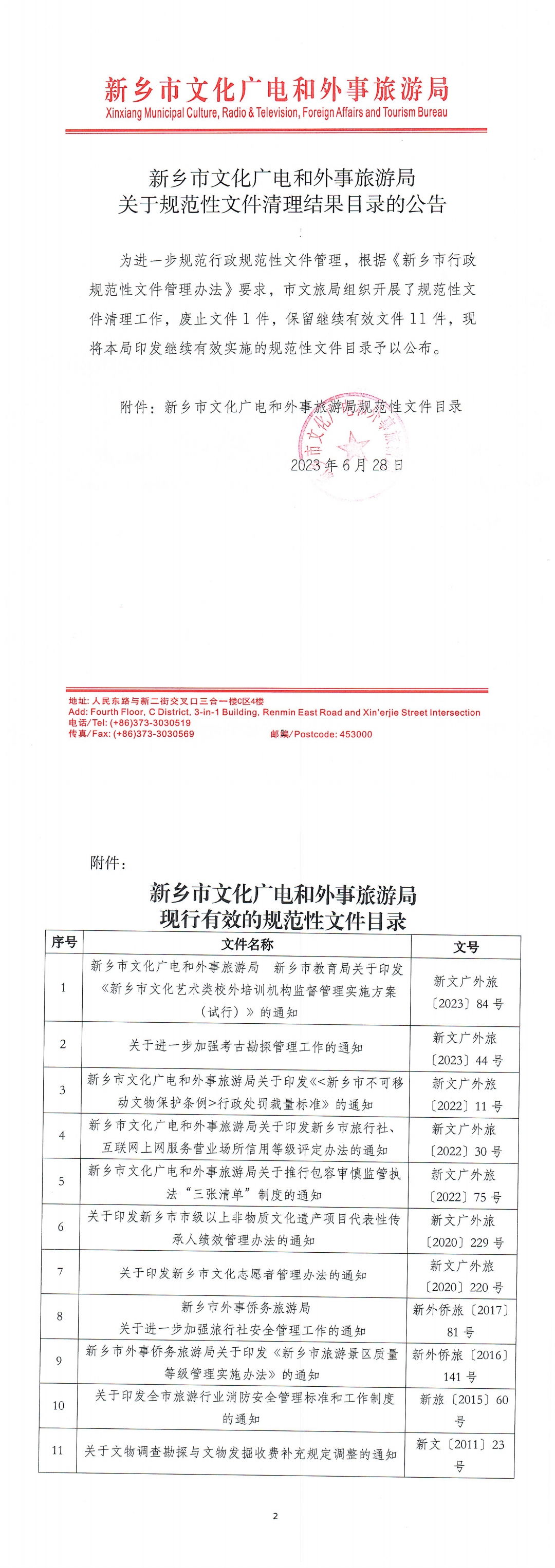 新乡市文化广电和外事旅游局关于规范性文件清理结果目录的公告